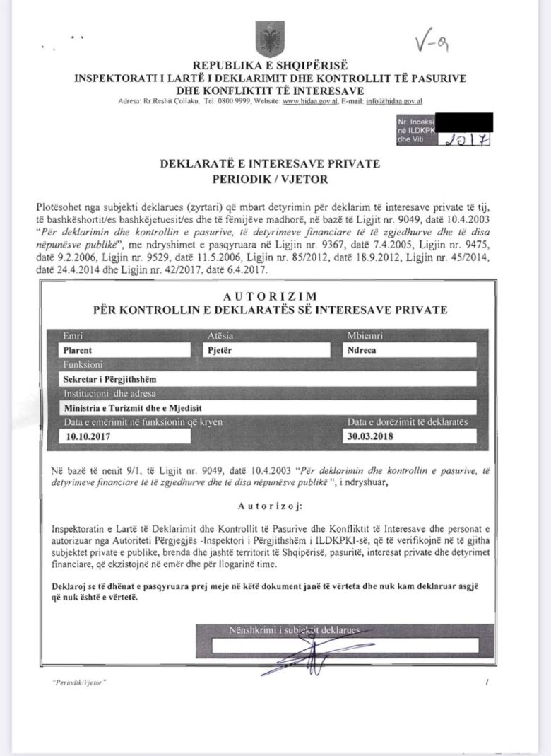 Situata ndryshon në deklaratën e pasurisë para fillimit të detyrës së re, si Sekretar i Përgjithshëm i Ministrisë së Brendshme, në vitin 2019, ku Plarent Ndreca sipas dokumentit në ekran, i deklaron aksionet e kompanisë Domus Nostra duke sqaruar se tashmë subjekti ka pezulluar aktivitetin.