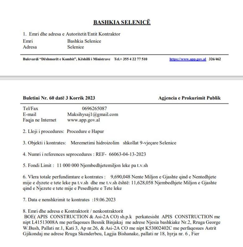Ka lidhur kontratën më datë 09 Korrik 2024 me objekt: Rikonstruksion i Shkollës 9-vjeçare ‘Dëshmorët e Peshkëpisë’, afati 7 muaj, me vlerë 753 mijë euro, dhe kontraktor Asi-2A CO shpk me pronar bashkëshortin e nënkryetares së bashkisë Fier, Eleni Gjikondaj, denoncuar më parë nga PD.