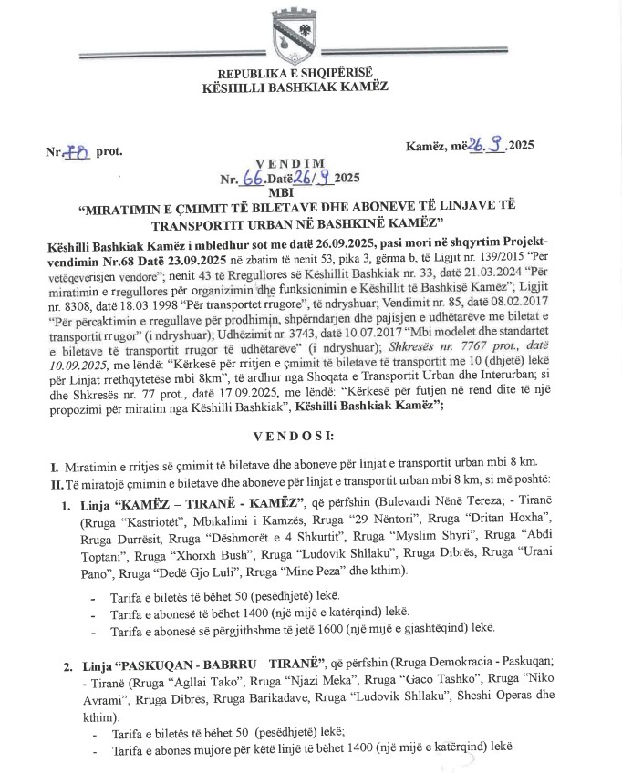 1️⃣ Vendimi ka ardhur pas një kërkese zyrtare nga Shoqata e Transportit, e cila është depozituar pranë Këshillit Bashkiak të Kamzës.