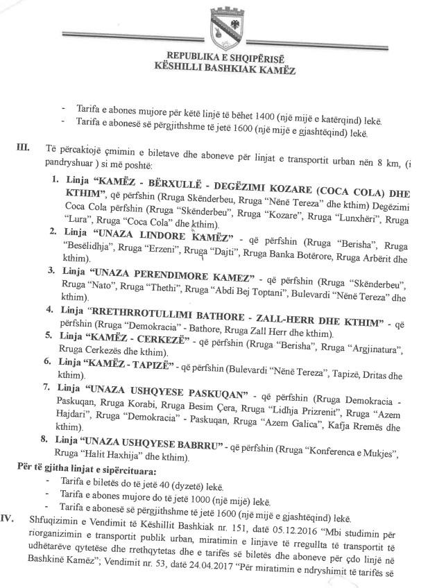 Duke filluar nga dita e nesërme qytetarët që përdorin linjën rubane Kamëz-Tiranë, dhe linjën Paskuqan-Babrru-Tiranë, do të paguajnë 50 lekë biletën e urbanit, dhe 1400 lekë për abonenë mujore. Pas këtij lajmi Bashkia Kamëz, ka publikuar në llogarinë e saj në rrjetin social “FaceBook”, vendimin e marrë nga këshilli i bashkisë, në të cilin sqarohen arsyet e rritjes së çmimeve të biletave dhe aboneve për qytetarët duke theksuar faktin qe ne linjate brendshem ska ndryshuar cmim.
